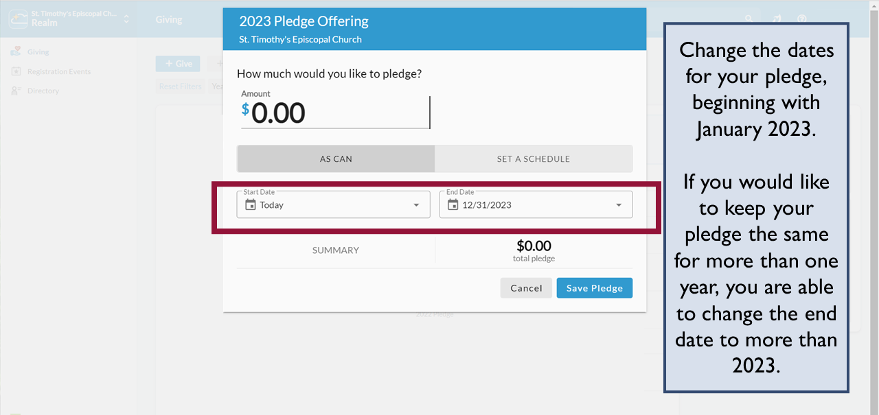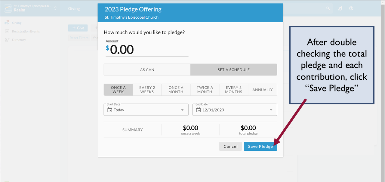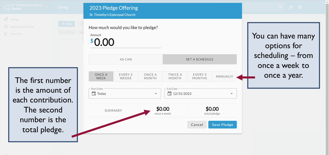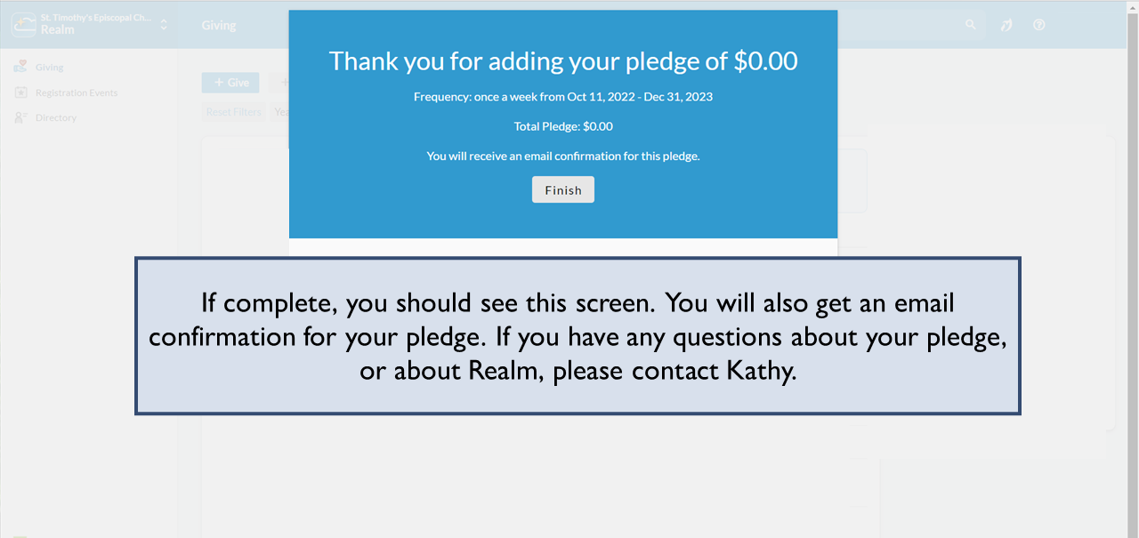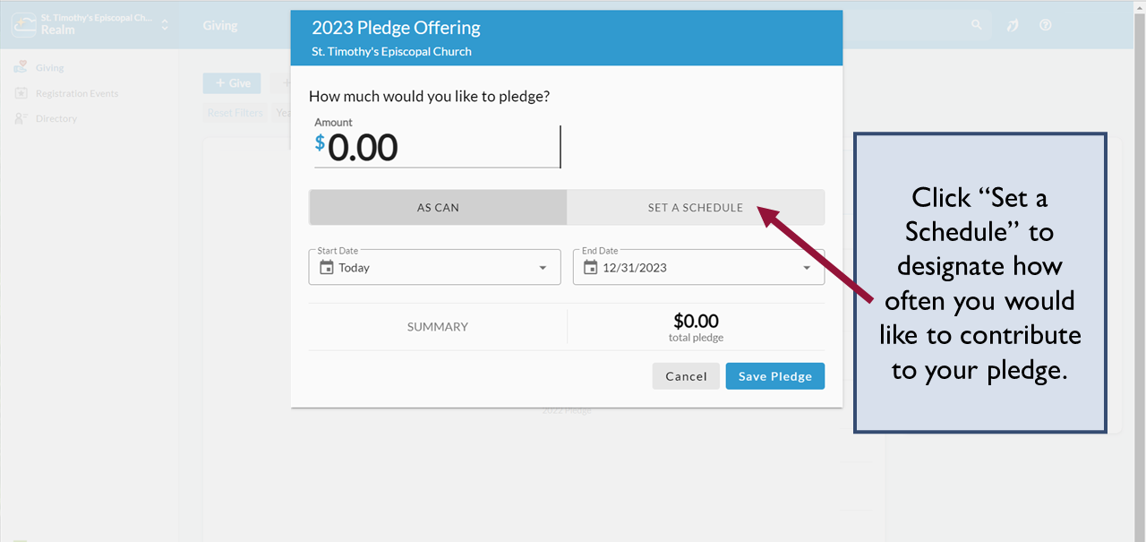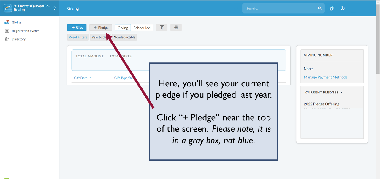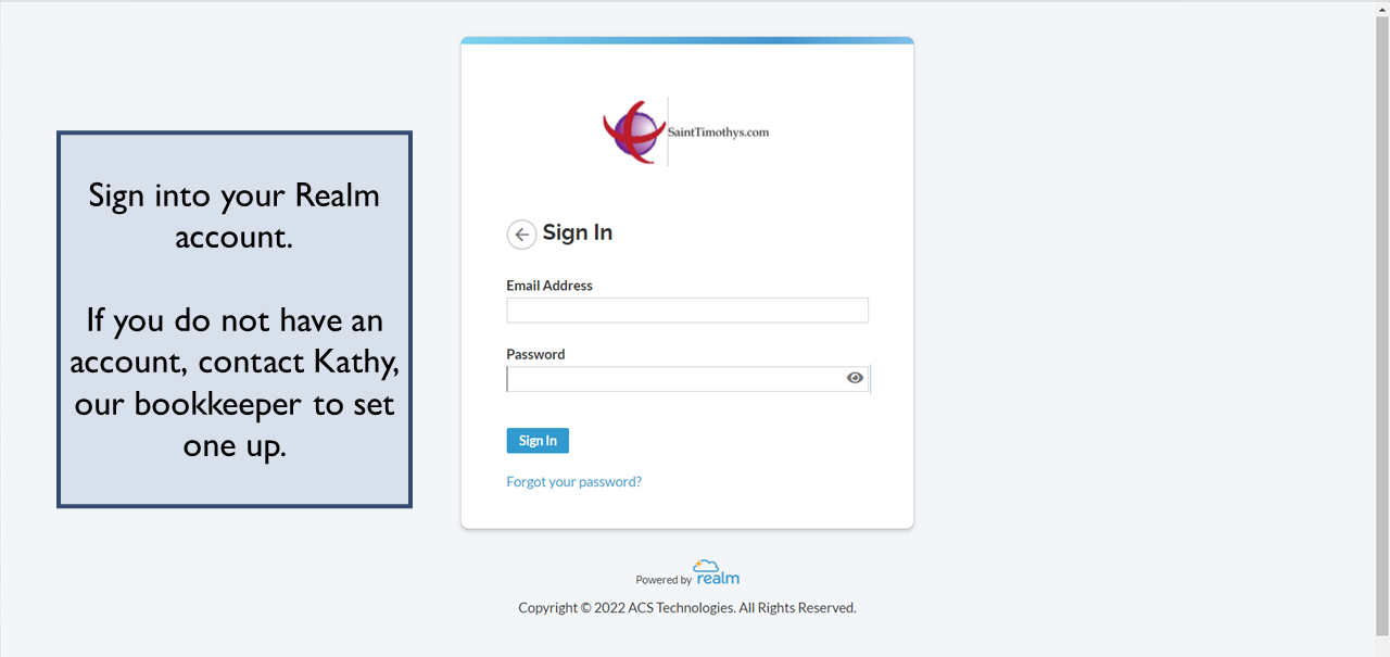 Saint Timothy’s uses a program called “Realm” to process pledges and giving. You will need a personal login, so if you have not yet set up a Realm account, please contact Parish Bookkeeper, Kathy at KathyM@SaintTimothys.com.